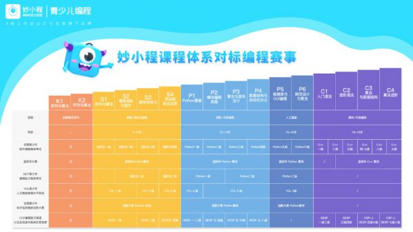 少儿编程教育机构-妙小程C++信奥赛编程课程,涵盖C++语法和C++算法的课程内容;C1阶段-C2阶段将完成C++语法基础到进阶的学习,让孩子了解C++的语法知识,孩子学完可参加GESP二级和全国电子学会计算机等级二级考试。C3阶段-C4阶段将完成C++算法知识的学习,孩子学完可参加CSPNOIP系列赛事、GESP六级、七级、八级和全国电子学会计算机七级和八级考试。妙小程学员在中国计算机学会主办的青少年信息学奥林匹克竞赛(入门级)的整体获奖率超过91%。