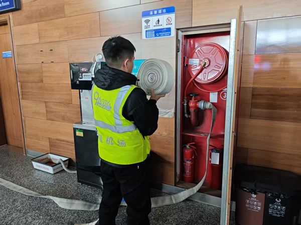 此次专项维保紧扣冬春换季消防设施运维重点,严格按照民航消防设施管理规范,对航站楼、办公区、飞行区、机坪等区域的全部室内、室外消火栓进行全覆盖、无死角检修。维保人员严格遵循操作流程,重点开展两大核心维保工作,一是全面开展消火栓排水作业,彻底排空消防管道及消火栓内部残留铁锈及杂质,防止造成管道堵塞、阀体损坏,同时清理消火栓井内、接口处泥沙、杂物及锈蚀残渣,保持设施内部洁净通畅,二是进行系统压力检测,对消防供水管道、消火栓阀门逐一进行加压测试,精准检测管道水压、密封性能及阀门启闭灵敏度,详细记录压力数据,排查管道渗漏、阀门卡顿、压力不足等隐患问题。